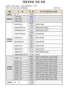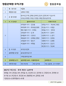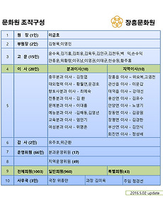 장흥문화원소개/조직구성7 [조직] 2025 장흥문화원 임원 현황(2025.4.23 현재) 장흥문화원 임원 현황▪임원: 32명 ▪운영위원 : 88명▪총 : 120명 (임원+운영위원) 2024. 6. 20. [조직] 2023 장흥문화원 임원 현황(2023.6.26 현재) 장흥문화원 임원 현황 ▪임원: 32명 ▪운영위원 : 87명 ▪총 : 119명 (임원+운영위원) 2023. 4. 13. [조직구성] 장흥문화원 조직도 2020. 8. 28. [조직]2020 장흥문화원 임원 현황(2020.3.31 현재) [조직]2020 장흥문화원 임원 현황(2020.3.31 현재)▪임원: 30명 ▪감사 : 2명 ▪운영위원 : 77명 ▪총: 109 (임원+감사+운영위원) 2020.3.31 2020. 5. 6. [조직]2019 장흥문화원 임원 현황(2019.3.28 현재) 장흥문화원 임원 현황 ▪임원: 30명 ▪운영위원 : 78명 ▪감사:2명▪총: 110명 2019.3.28 2019. 4. 11. 장흥문화원 조직구성(이사+운영위원)2017년7월 2017. 7. 5. 장흥문화원 조직구성(이사+운영위원)2015년~2016년 2015. 9. 4. 이전 1 다음
