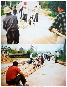 장흥열린자료실(DB)/■장흥 고싸움줄당기기(2013년)4 장흥고싸움 줄당기기 Ⅲ. ‘고싸움줄당기기’란 명칭에 담긴 뜻 민속놀이의 명칭에는 지역 고유의 언어 표현이 담겨 있기 마련이다. 이런 까닭에 표준어 표기에 얽매이지 않고 지역적 특생을 담은 명칭을 사용할 필요가 있다. 이 책에서 ‘고싸움줄당기기’란 명칭을 사용하게 된 배경을 밝히기로 한다. 장흥에서는 예전부터 ‘고쌈’ 또는 ‘고싸움’, ‘고줄쌈’, ‘고줄놀이’란 말을 사용해왔고, ‘고줄 고향 장흥’이란 표현도 써왔다. 또한 ‘줄당긴다, ’줄땡긴다‘란 말도 사용해왔다. 문헌에는 삭전 또는 삭희란 말이 등장하지만 일상적으로 사용되는 경우는 거의 없고, ’줄다리기한다‘하는 말도 잘 사용되지 않았다. 이에 비해 ’고쌈한다‘, ’고줄쌈한다‘, ’줄당긴다‘, ’줄땡긴다‘라는 표현들이 빈번하게 사용돼 았다. 이 명칭들에는 고를 갖고 싸우.. 2020. 6. 9. [장흥고싸움 줄당기기] Ⅰ.제11회 전국민속예술경연대회 관련 사진자료 제11회 전국민속예술경연대회 관련 사진자료(故 지춘상 교수 제공) 제11회 전국민속예술경연대회에 참가하기 위해 장흥읍 원도리(현 장흥교도소 자리) 들판에서 연습하는 장면(1970년) 제11회 전국민속예술경연대회에 참가하기 위해 장흥읍 원도리 들판에서 연습하는 장면으로 주변에 초가들이 보임(1970년) 고줄 위에 소리꾼과 줄패장을 태우고 행진하는 장면. 예전에는 문벌과 재력을 어느 정도 겸비한 한량들이 기생을 태우고 행진을 했다고 함. 기생의 설소리에 맞추어 멜꾼들은 “상, 사-, 뒤~여!” 하는 후렴구로 화답함(1970년 광주) 제11회 전국민속예술경연대회에서 청사초롱을 단 고줄을 메고 행군하는 장면. 청사초롱의 모양이 현재의 것과는 다르며 고머리에 색천이 감겨 있지 않음(1970년) 제 11회 전국민속.. 2020. 6. 9. [장흥고싸움 줄당기기] Ⅱ.군민의 날·보림문화제 사진자료 Ⅱ.군민의 날·보림문화제 사진자료(양기수 제공) 1. 제 20회 군민의날 보림문화제(1990년) 덕석기를 앞세우고 출전하는 암고 1990년 당시의 고에는 청사초롱과 국기, 군기, 새마을기를 달았음. 탐진천변의 행사장으로 진입하는 고의 행렬, 장흥고의 특징을 보이는 고의 행렬과 화려함이 보임. 고싸움을 앞두고 고를 인도하는 농악대와 고줄. 암줄과 숫줄에 빨간천과 파란천으로 고머리를 장식함 고싸움에 출전하는 암고. 고싸움에 출전하는 숫고. 탐진강변에서 마지막으로 이뤄진 고싸움. 고싸움을 끝낸 후, 암고가 숫고와의 결합을 위해 어우르는 광경. 줄다리기를 위해 암수고가 결합되는 장면. 줄다리기중 “깔아라” 하는 소리와 함께 줄을 깔고 앉아있는 편(우측)과 줄을 계속 당기는 편(좌측)의 모습. 장흥 고싸움의 특징.. 2020. 6. 9. [장흥고싸움 줄당기기] Ⅲ. 고줄 제작 사진자료 Ⅲ. 고줄 제작 사진자료(양기수 제공) 1994년 4월 20일 행원마을 분들이 고를 만들기 위해 기본 새끼 줄꼬기를 하는 모습. 기본 새끼줄로 3합의 줄을 만듦. 3합 줄을 다시 3합하여 9합의 줄을 만드는 모습. 9합의 줄을 다시 3합하여 27합의 줄을 만듦. 27합의 줄을 다시 3합하여 81합의 줄이 되어 고 모양을 이룸. 81합이 된 고를 접어 몸통을 만듦. 고머리에 대나무를 넣고 새끼줄로 다시 감아 고의 모양을 만들면서 고싸움을 할 때 쉽게 부셔지지 않도록 보강함. 완성된 서부고. 군민회관 앞에서 고를 떠멜 장정들을 기다리는 1994년 5월 1일의 아침. 2020. 6. 9. 이전 1 다음